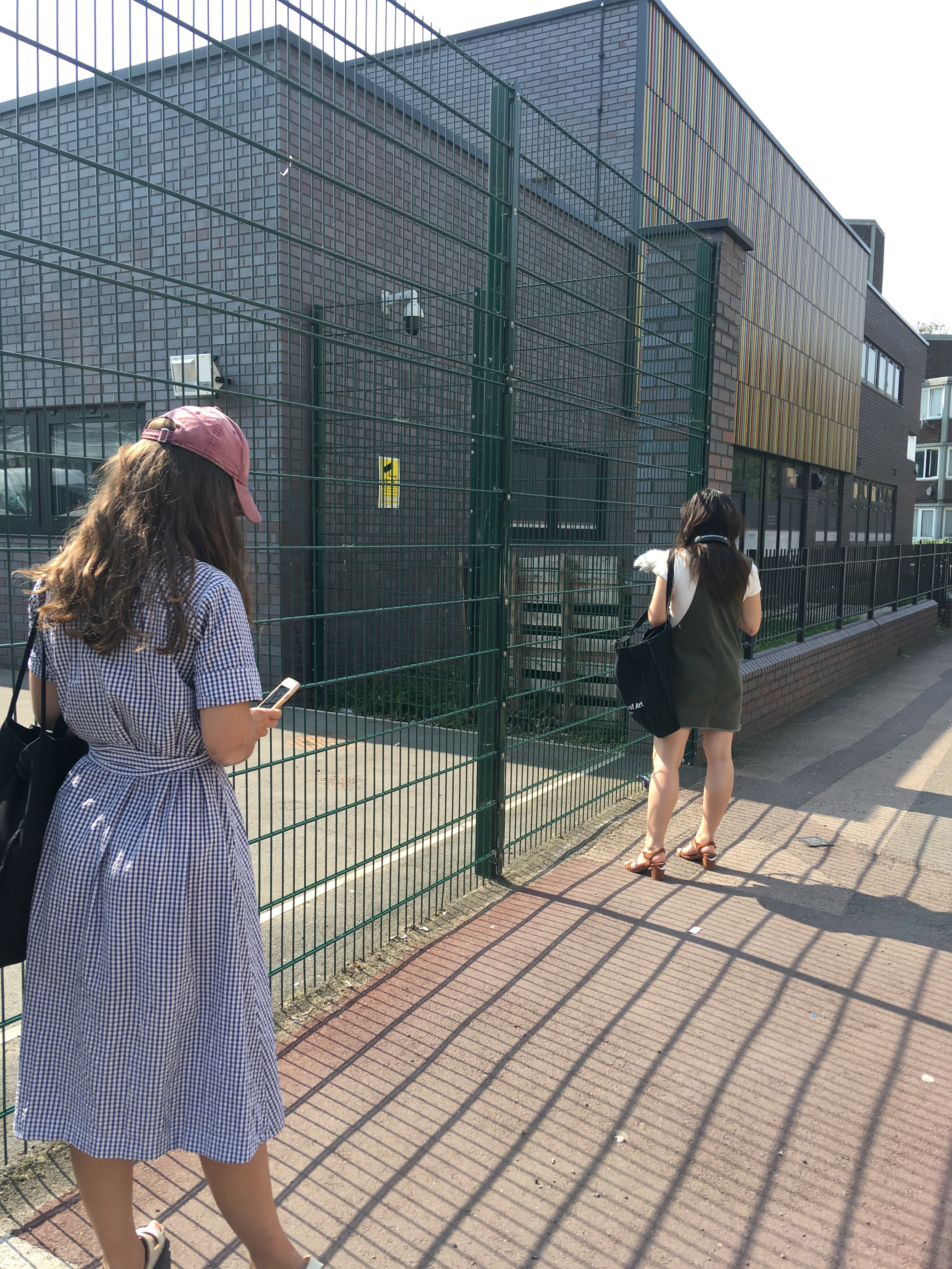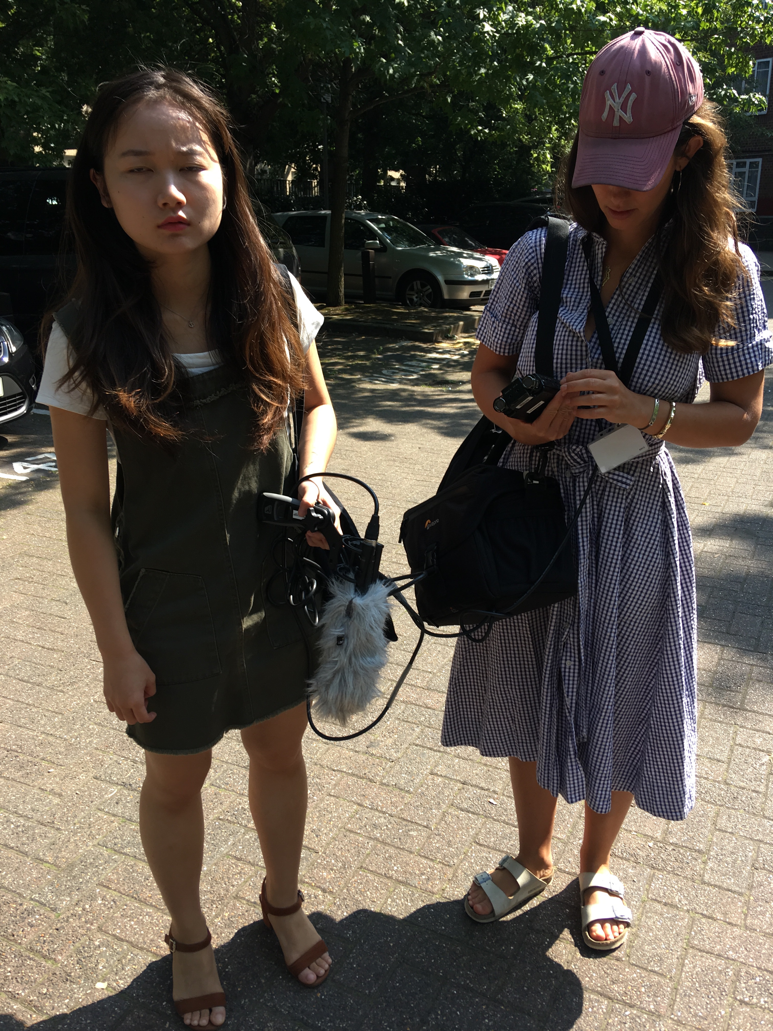 Livia and partner recording a school playground, empty, silent, but for the buzz of the generator.