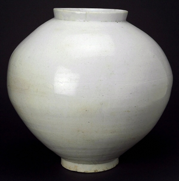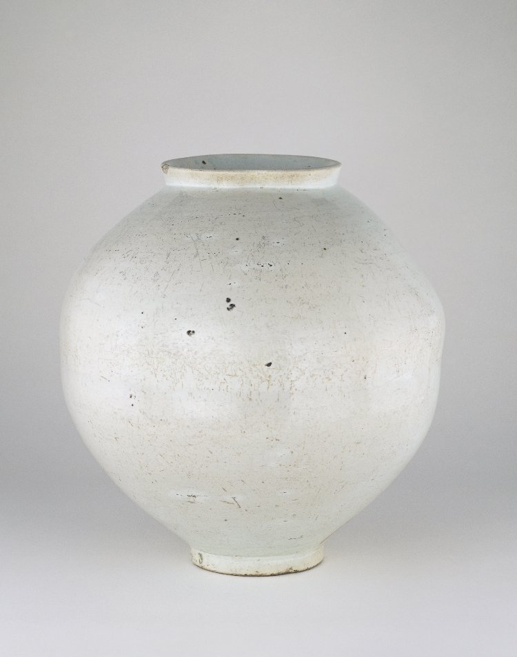 ‘This large porcelain jar has a voluminous and globular body, evoking images of a full moon and thus today jars of this type are called “moon jars.” The jar is 47 centimetres in height, relatively large among the remaining moon jars. A discernible horizontal seam at the center of the body indicates that two bowl-shaped halves were joined together to make the jar. As a form composed of two large halves, the jars would shrink and sag in the firing which resulted in each jar having a unique, asymmetrical shape. The popularity of this form in the 17th and 18th centuries attests to a Joseon aesthetic sensibility that appreciated naturalism and spontaneity over rigid perfection. Clear, pale white glaze is applied over the surface of the jar, showing a sense of age with the crackles and scratches on it. The shoulder of the jar partially has traces of ash, adhered during firing in a kiln. The foot was roughly and deeply carved at the base, and the foot ring and the base were wiped clear of the glaze.’