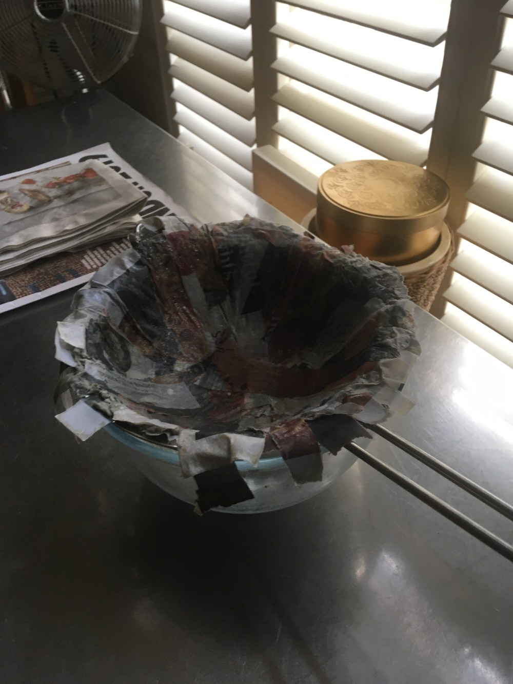 Ok I know it doesn’t look like much. I started off with high hopes. I couldn’t resist a peek. Moon jar made from paper and egg boxes now with liberal lashings of rabbit skin glue is half a moon jar. I rather like it.