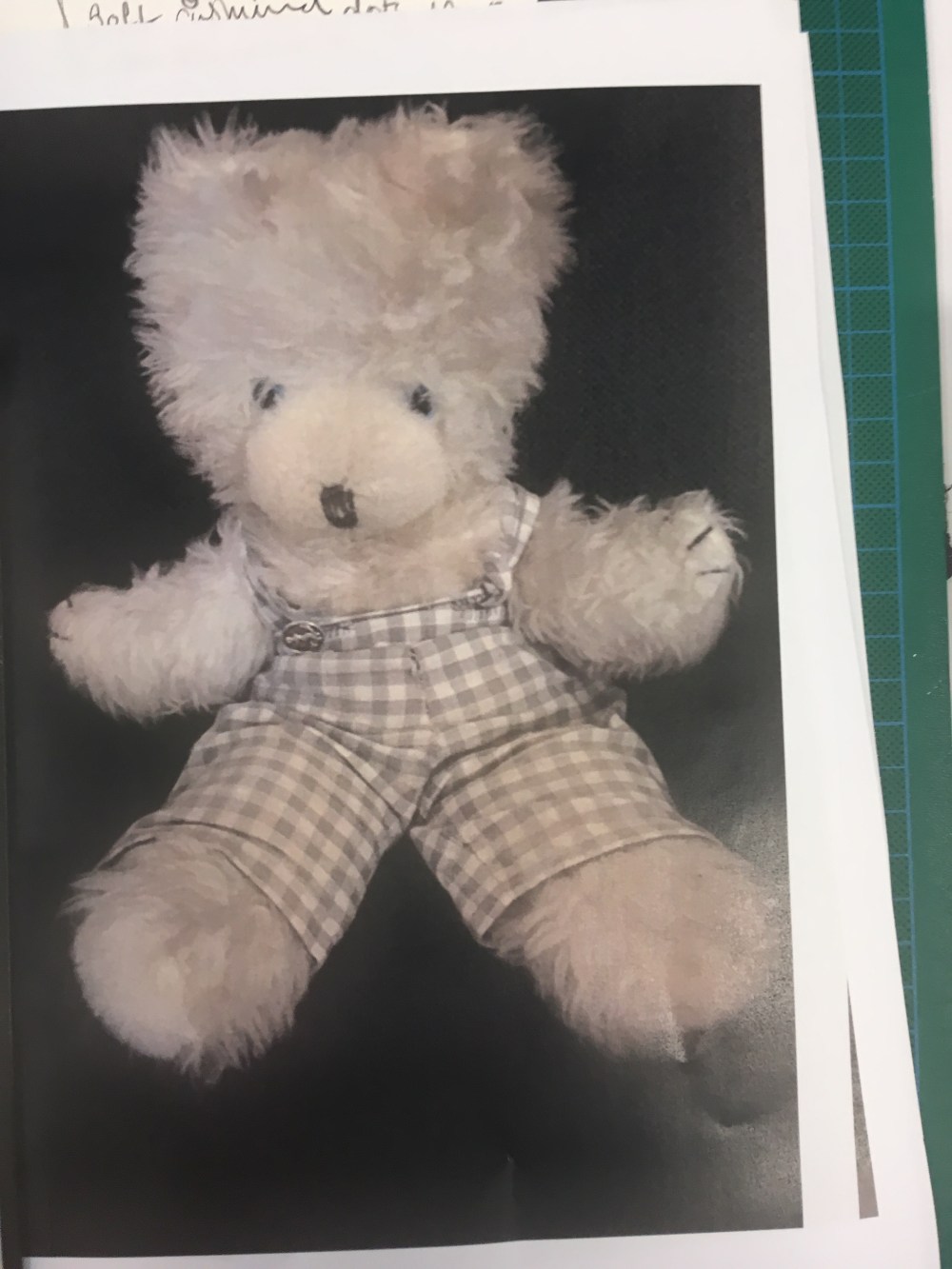 It had an anchor on it. It had lines, scribed horizontally across the french brass surface, blackened for effect. The button was attached to black and white checked cotton surface, some small dungarees my mother was sewing for my shaggy white teddy with blue eyes.