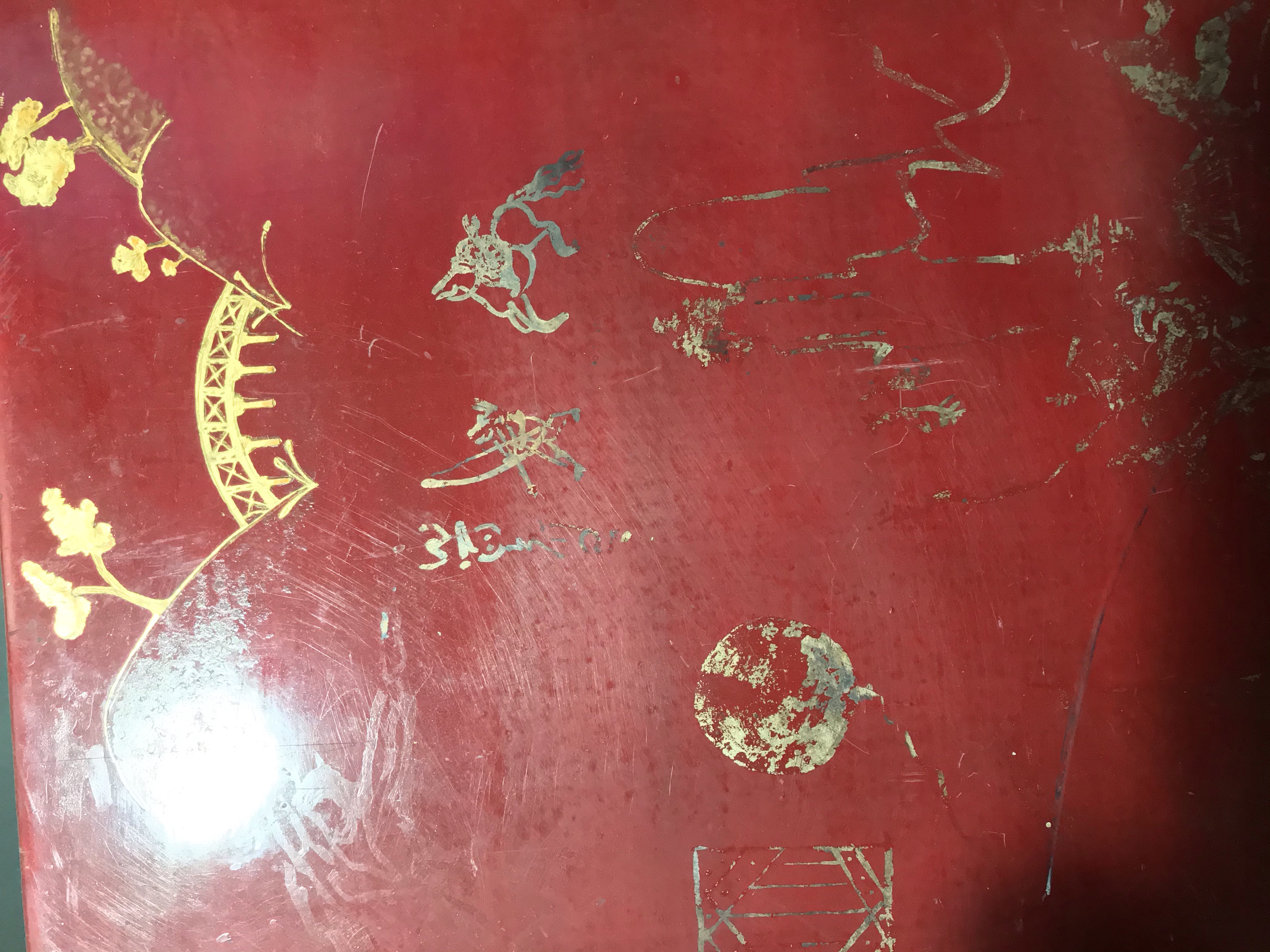 I found Gesso boards, lacquer, Togidashi, paint finishes, paint charts, maquettes, gilding samples, preparing samples, repairing samples, printing, painting and drawing Samples, collage, glue solvents and pigment samples. Old equipment put away when the children where starting to walk – it was dangerous to leave them out.
