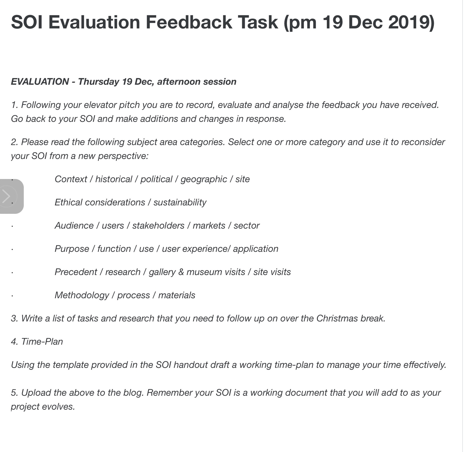 - Following your elevator pitch record, evaluate and analyse the feedback you have received. Go back to your SOI and make additions and changes in response.