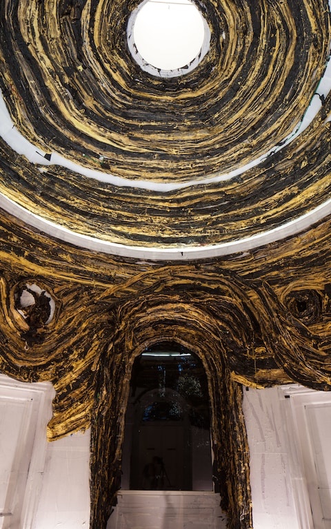 Mark Bradford’s giant sculpture Mithra resembles Noah’s ark