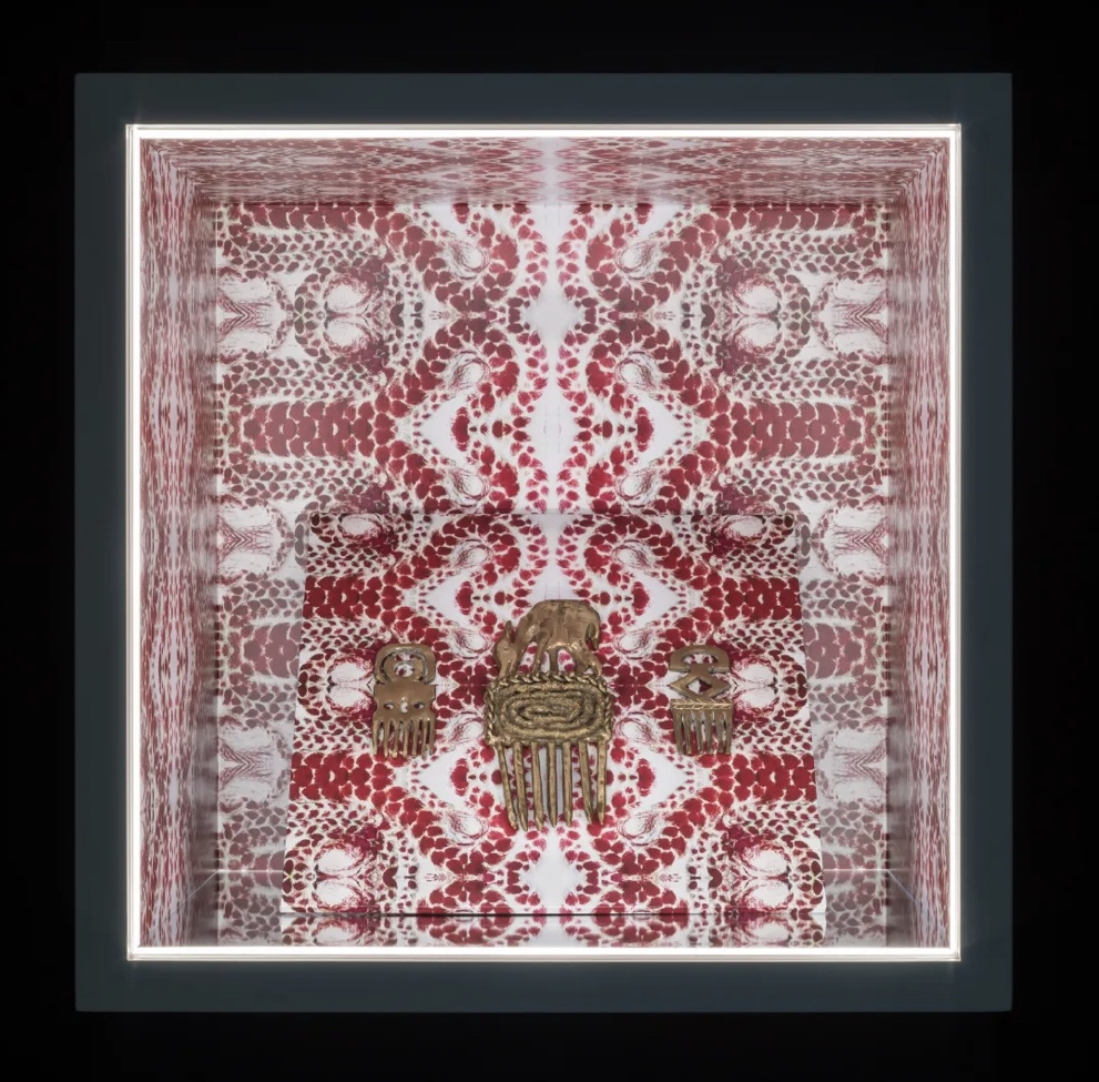 In Negritude No.1 (2017-2020), the wallpaper which lines the interior of The Box, Coakley takes African Caribbean coiffure as her point of departure, digitally manipulating collograph-printed synthetic hair to create patterns that recall and subvert traditional 18th and 19th century British designs. Drawing on an art form so intimately associated with the middle and upper-class white societies of the colonial era, Coakley draws attention to the ongoing influence of an aesthetics forged in the crucible of empire, an aesthetics repeatedly instrumentalised for the legitimation of imperial institutions and committed to the erasure or obfuscation of the other.