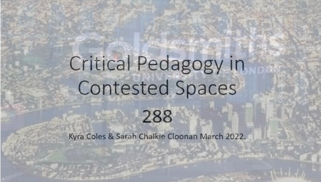 The collaborative exhibition/presentation/event is enabled through Practice-Based Inquiry (PBI) that puts practice and research at the heart of your learning experience. You will form small working groups to explore a specific range of themes related to pedagogy, politics, power and identity. Your group will utilise the time in Goldsmith’s sessions to develop a collaborative practice that will culminate in a collaborative exhibition/performance/event/presentation that will be presented/shared at Goldsmiths, at which time you will engage in a group viva.
